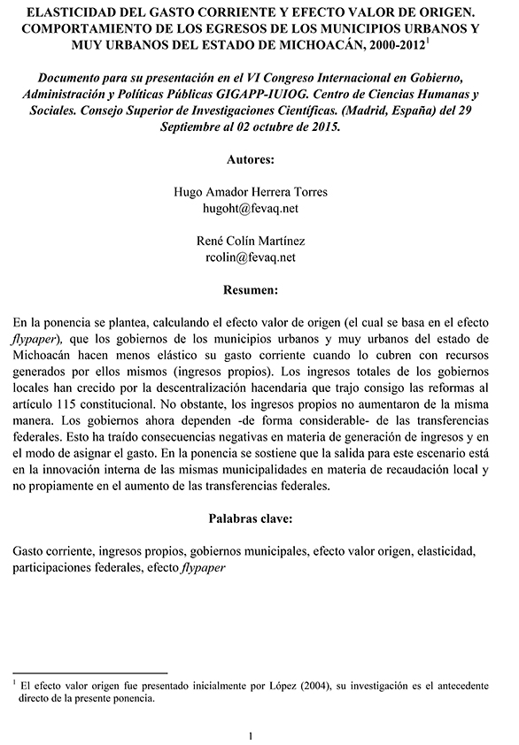 Herrera, Hugo y René Colín (2015), “Elasticidad del gasto corriente y efecto valor origen. Comportamiento de los egresos de los municipios urbanos y muy urbanos del Estado de Michoacán, 2000-2012”.