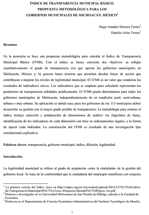 Herrera, Hugo y Daniela Arias (2014), “Índice de transparencia municipal básico. Propuesta metodológica para los gobiernos municipales de Michoacán, México”.